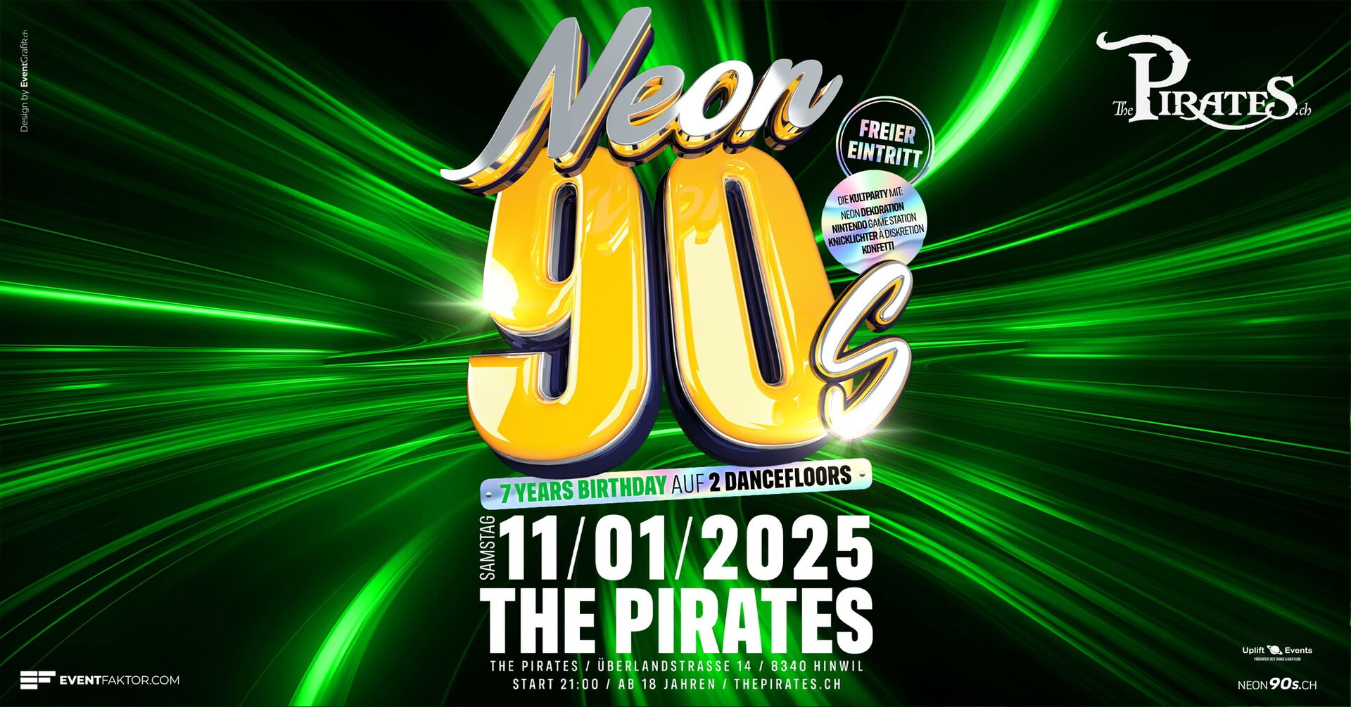 "🎉 Feiere mit uns das 7-jährige Jubiläum der legendären Neon 90's Party im The Pirates Hinwil!
