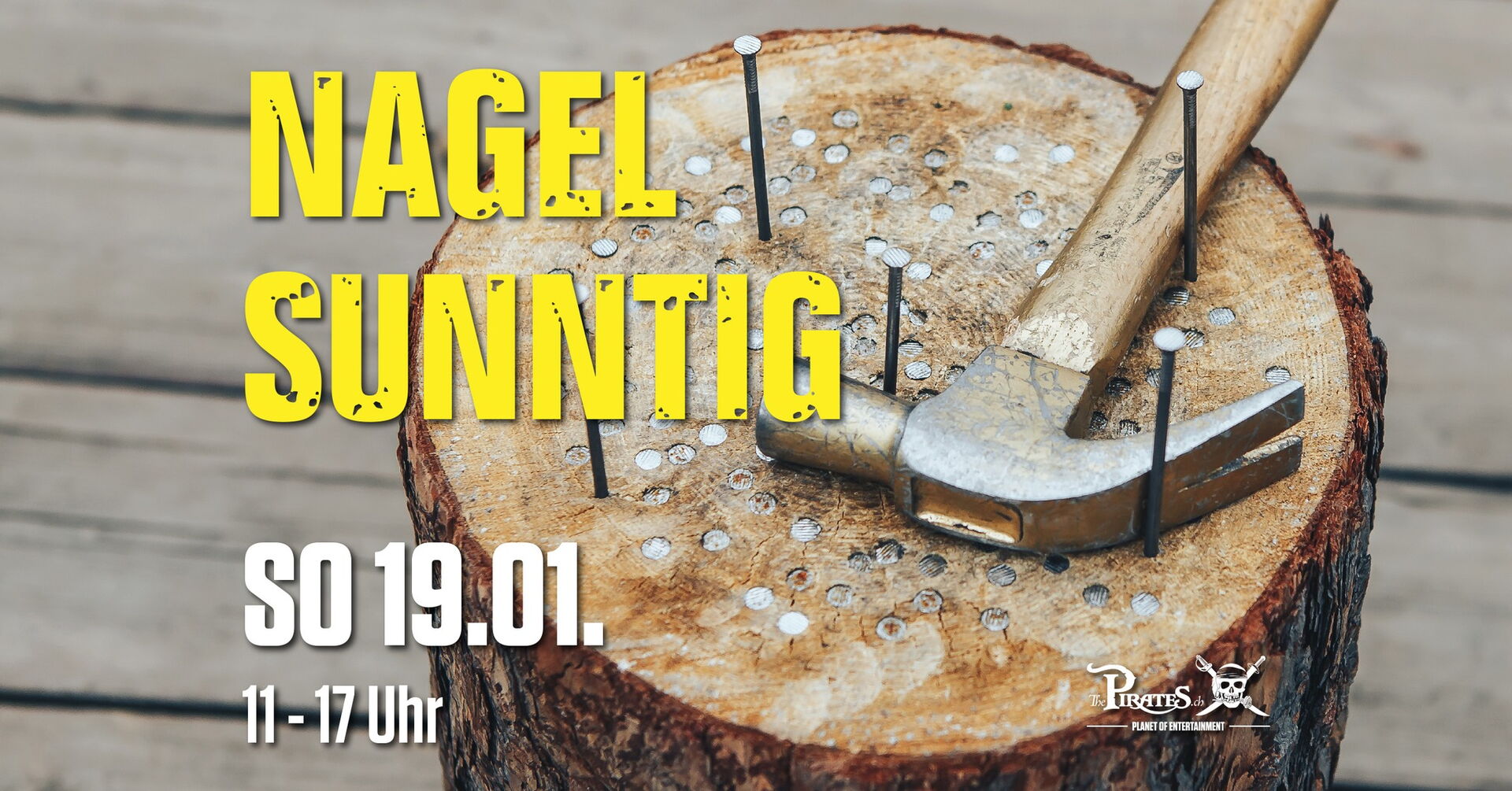 Am Sonntag, den 19. Januar, lädt The Pirates Planet of Entertainment zum spannenden Nagel Sunntig ein! Zwischen 11:00 und 17:00 erwartet euch ein Tag voller Geschicklichkeit und Spaß. Testet eure Treffsicherheit und versucht, Nägel mit möglichst wenigen Schlägen ins Holz zu schlagen. Ein Event für alle, die ihr handwerkliches Können unter Beweis stellen wollen!