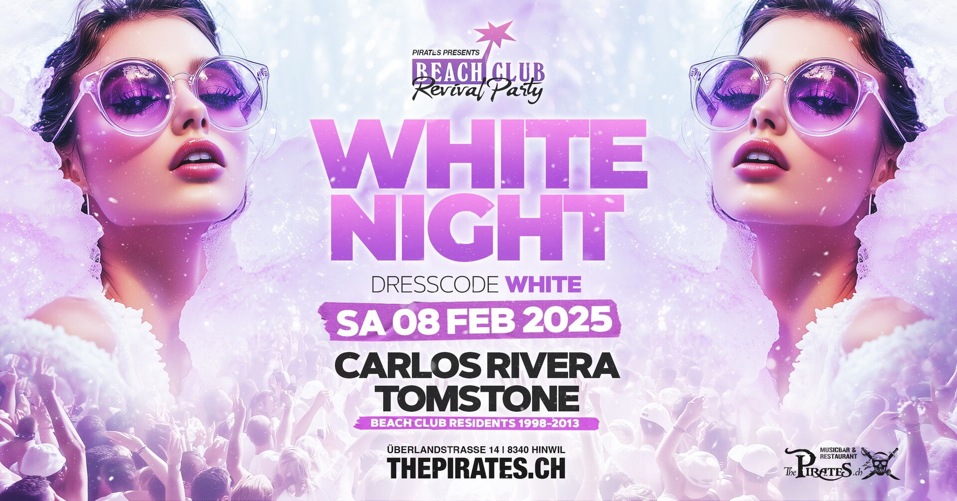 Beach Club Revival Party präsentiert am Samstag 08. Februar 2025 im The Pirates Hinwil: The White Night! Komm vorbei und geniesse eine unvergessliche Revival Nacht mit unseren Residenz DJs Carlos Rivera & Tomstone! Wir freuen uns auf Euren Besuch – am liebsten ganz in WEISS!