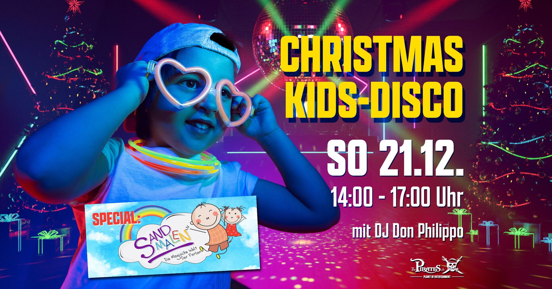 Am Sonntag, 21. Dezember verwandelt sich das Pirates Hinwil in eine bunte, leuchtende Weihnachts-Disco für Kinder!