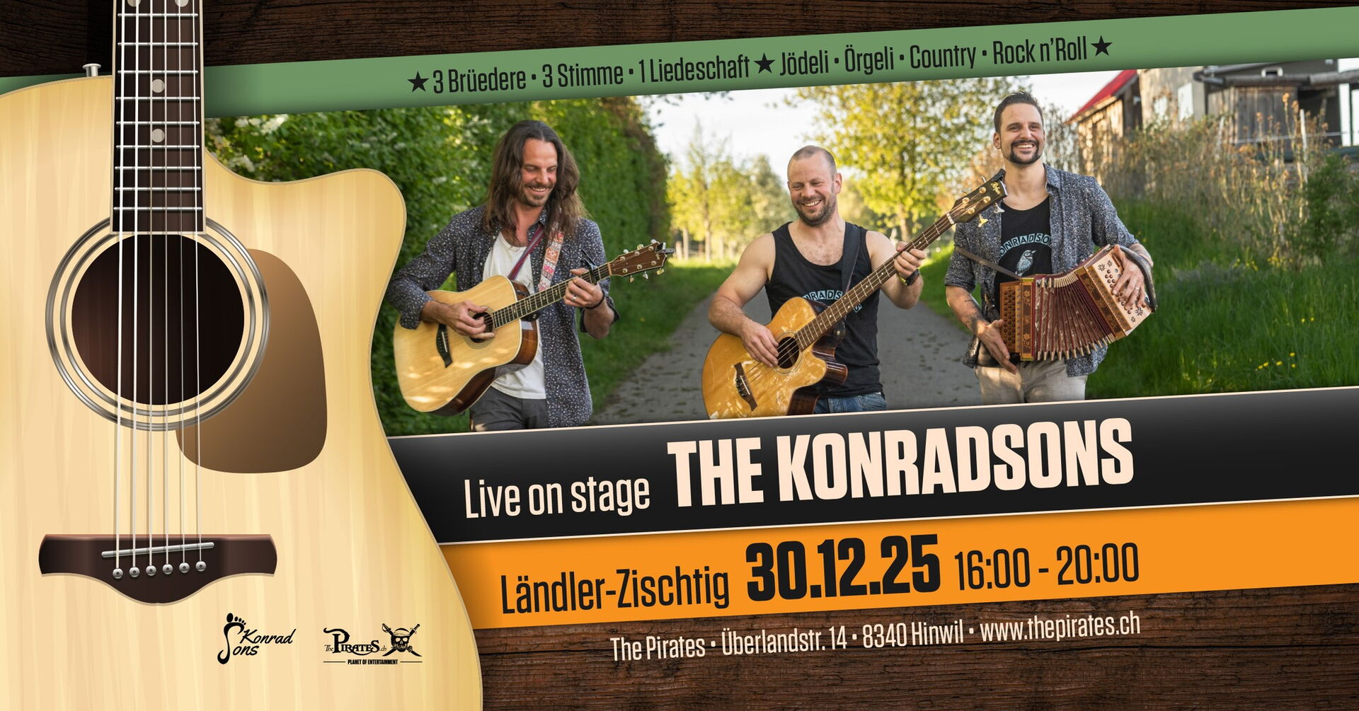 Am 30. Dezember 2025 erwartet euch ein besonderes Event im Pirates in Hinwil! Von 16:00 bis 20:00 Uhr heizen euch die Konradsons mit einer einzigartigen Mischung aus Ländler, Country und Rock'n'Roll ein. Die drei Brüder bringen nicht nur ihre Leidenschaft für die Musik, sondern auch ihre beeindruckenden Stimmen und Jodelkünste auf die Bühne.